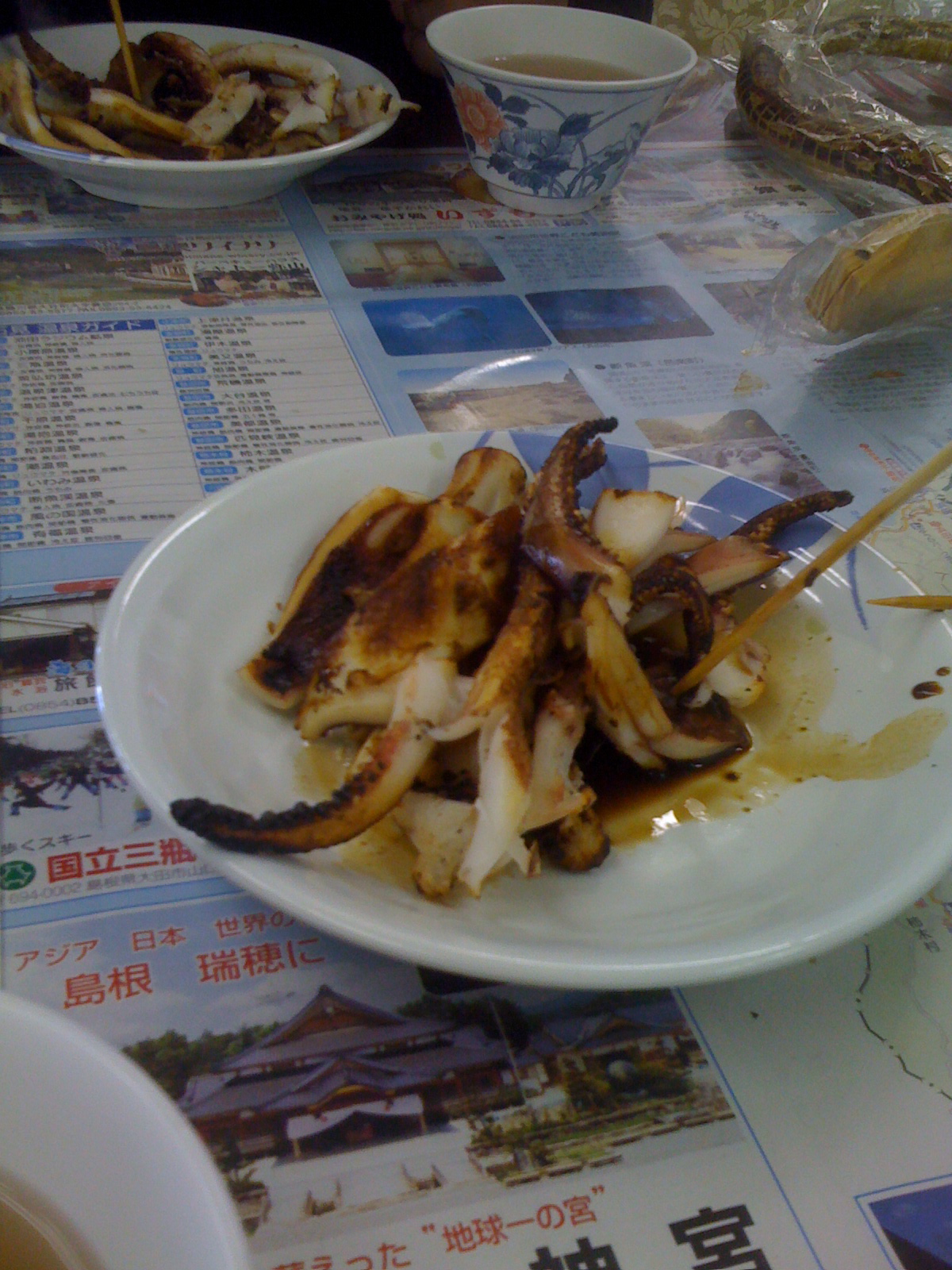 釣れない方が有力なのでまずイカ焼きを食いに行く(おごりで)。