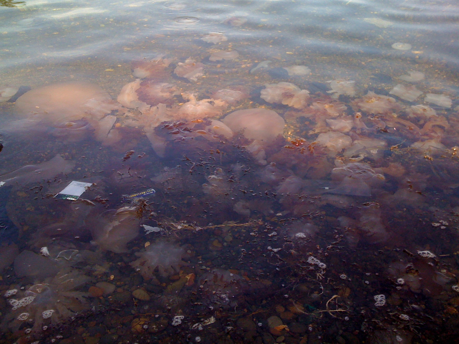 イカ食ってから港へ。行く途中波打ち際に大量のクラゲの死骸。
