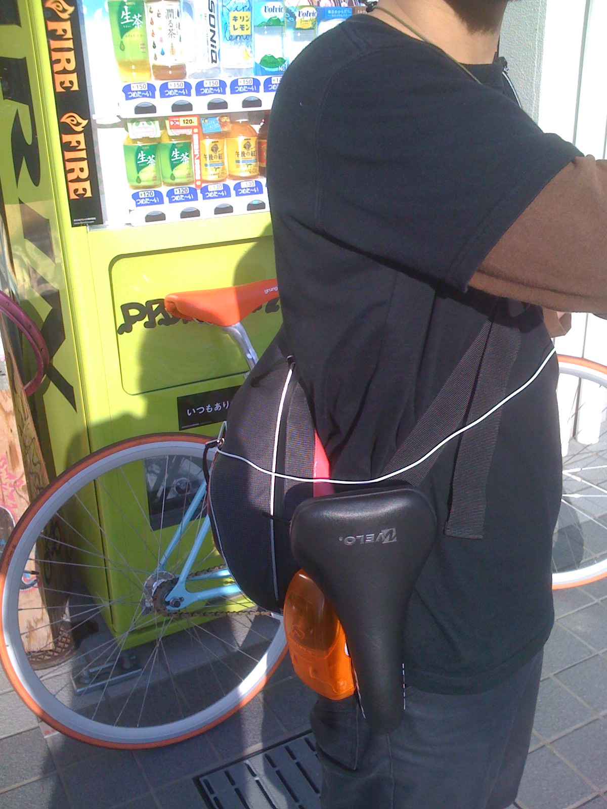 ちなみにfree space bar GREEN GREENのふみちゃんはオレンジのサドルを装着後純正シートをタイラップで鞄にくっつけて出勤。