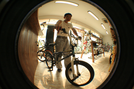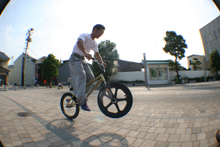 そんな昼下がりにBMXライダー朝日山さん汗だくでご来店。44歳位にしてチャリで跳ぶ漢。バニーホップをマスターするために店の向かいの広場へ。ハカセも丁度居合わせたので3人で乗る。