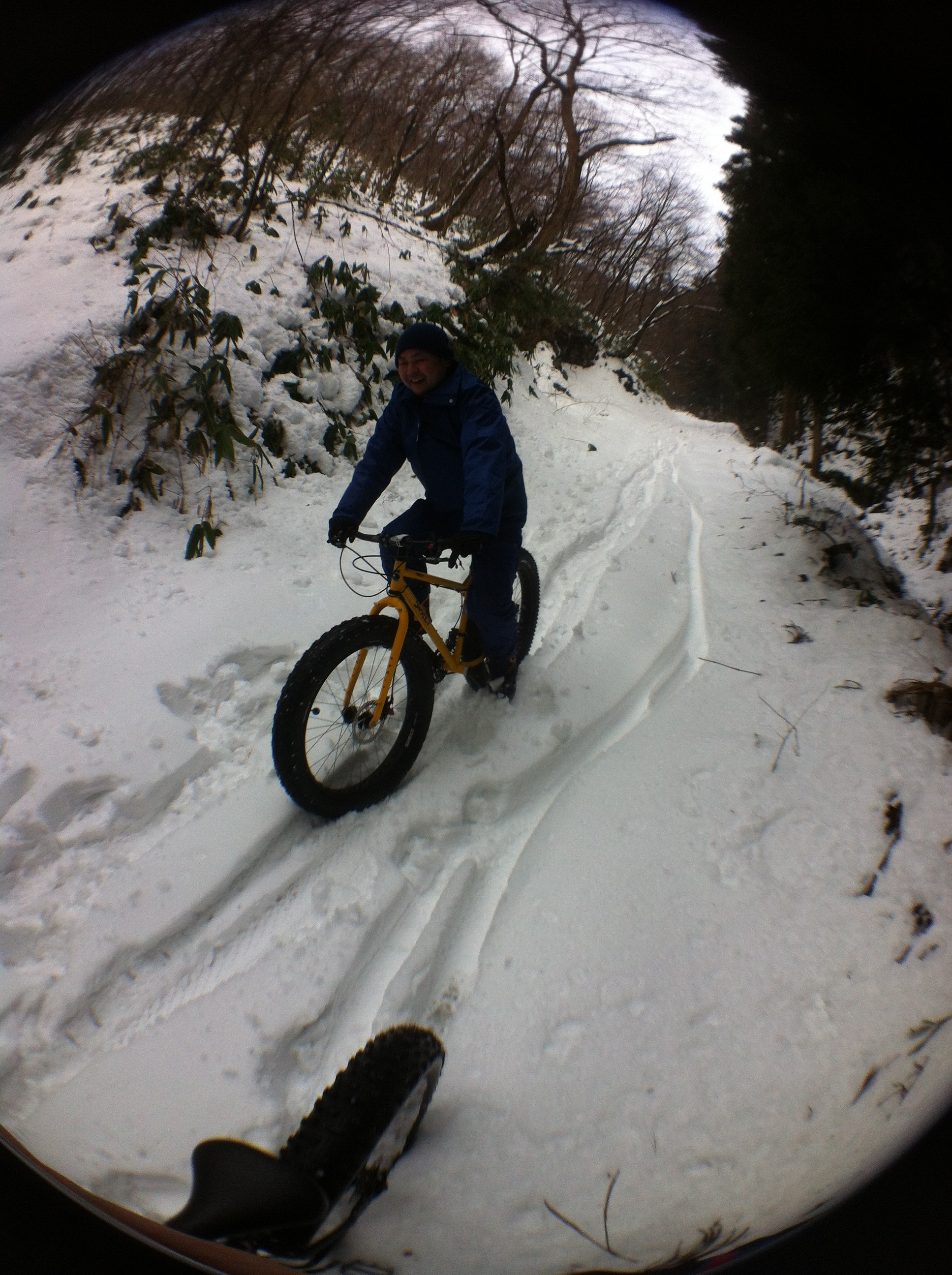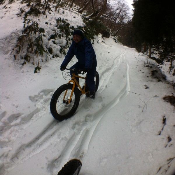 積雪30センチ以上の林道(登り)は辛い辛い修行そのものですが、下りで多少報われます!!「2013のパグで体力を消耗しておられるFさんの図」