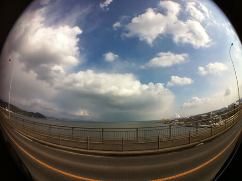 そして、巨大な橋を渡り境港へイン!!吹雪全開、歩道の雪全開。