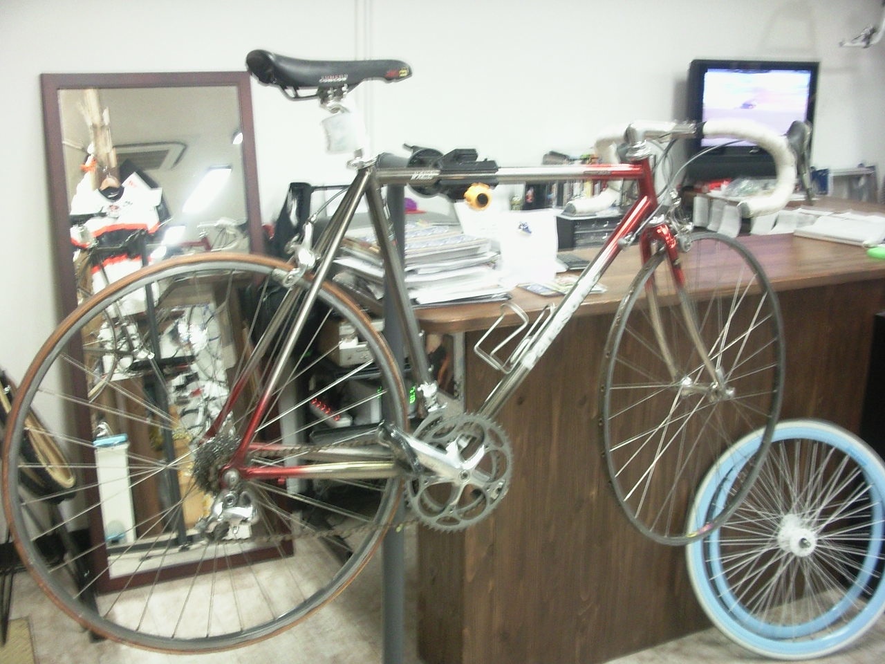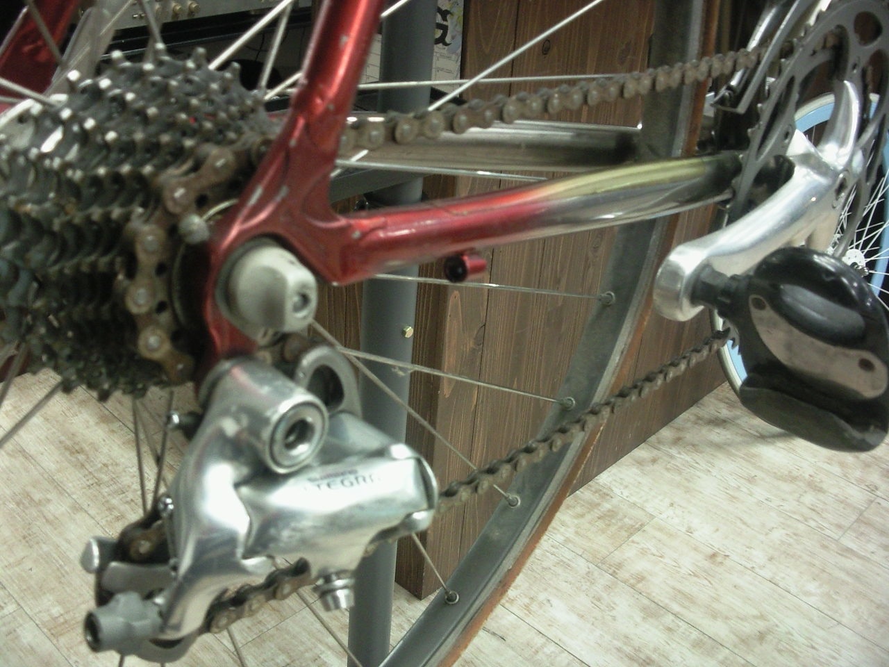 お客さんが持ってきたのは10年くらい眠り続けたロード。部活で使っていたのを再起動。フレームがチタン。そしてオーダー物。オーナーさんより一言、「まかせました」。