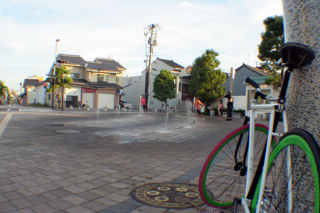 そして、最近は暑い。店の前には地面から噴水が出てくる謎の広場があります。ピストでスキッド練習したい人にはよい場所。つうわけで乗りに行ったオオケン(ピスト乗りさん)は少し乗って後は日が暮れるまでお客さんの子供と遊んでびしょびしょになって帰還。「少年のような青年」というお言葉に、「いや、青年にはなれません」でこの日は終わった。