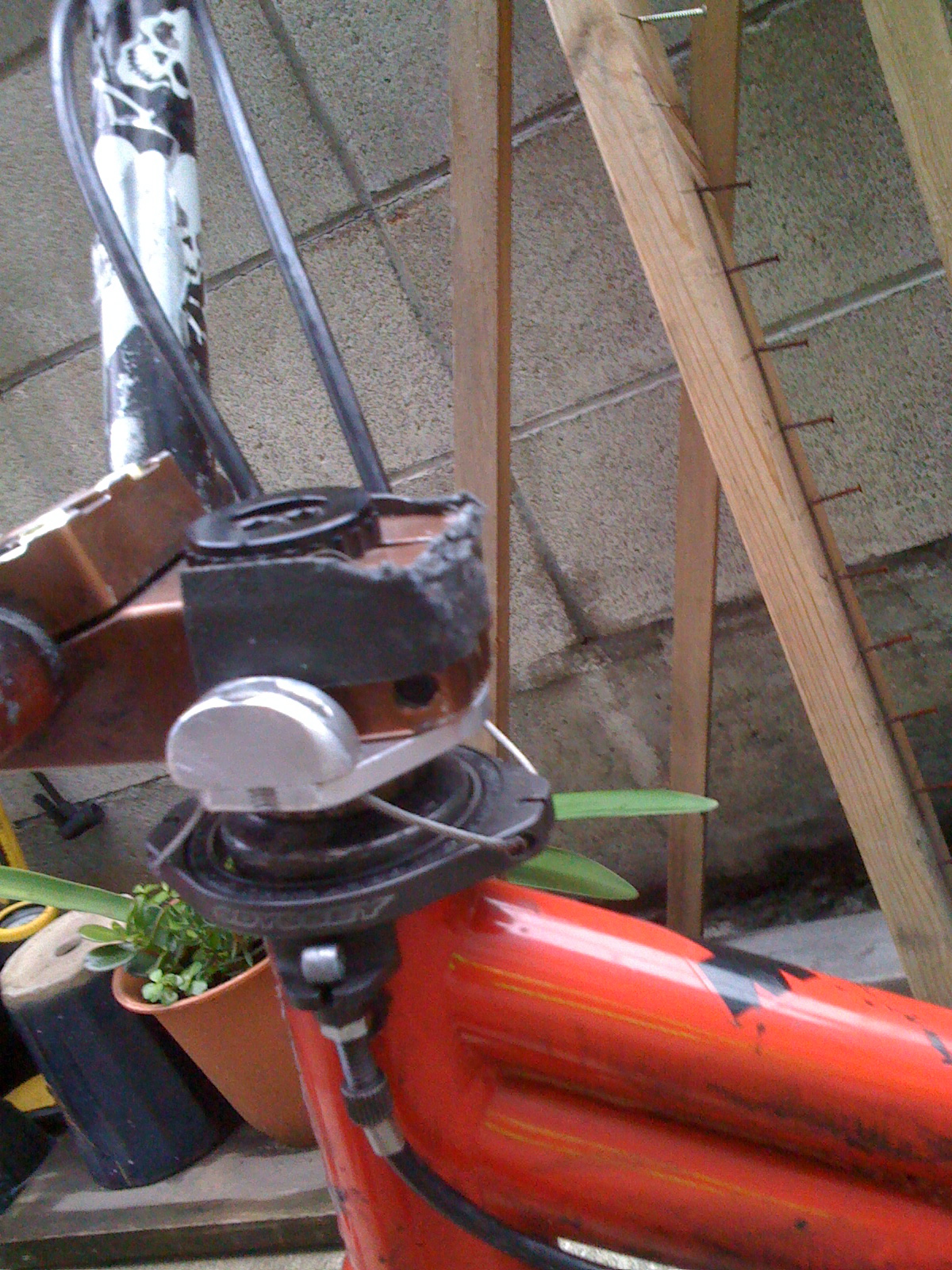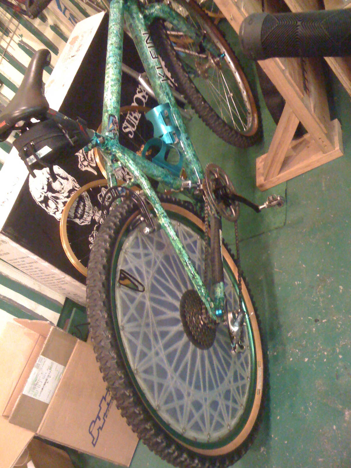 残念ながらこの日不在のAKIRAくん。自転車がおいてありました。マニアックにマジックフルーツのEくんがジャイロカスタムしたものを見る事に成功。