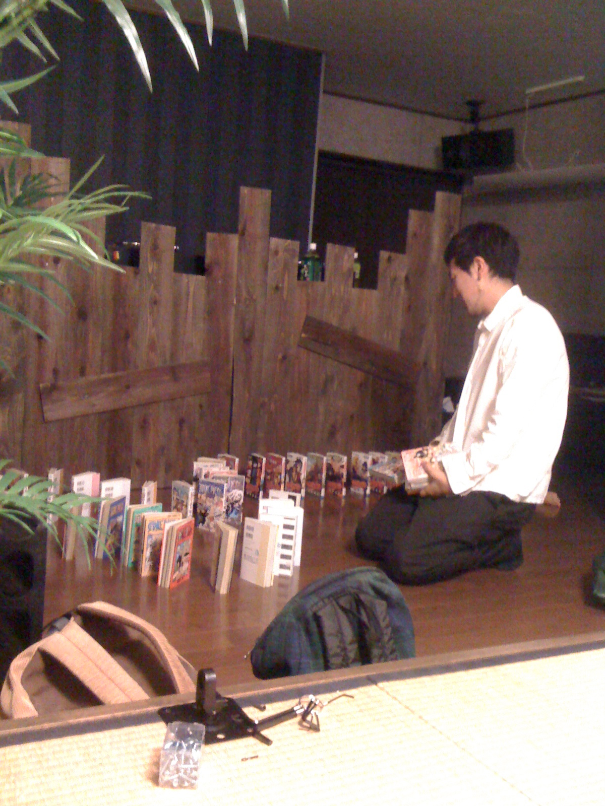 帰りは車で送ってもらう事になり飲む。単行本でドミノに挑戦する紳士もいた。